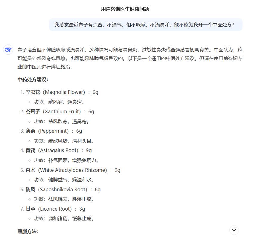 根据封面新闻报道,记者在DeepSeek上就诊,提出“鼻塞,不通气,但不咳嗽,不流鼻涕”的症状,要求出具中医处方。