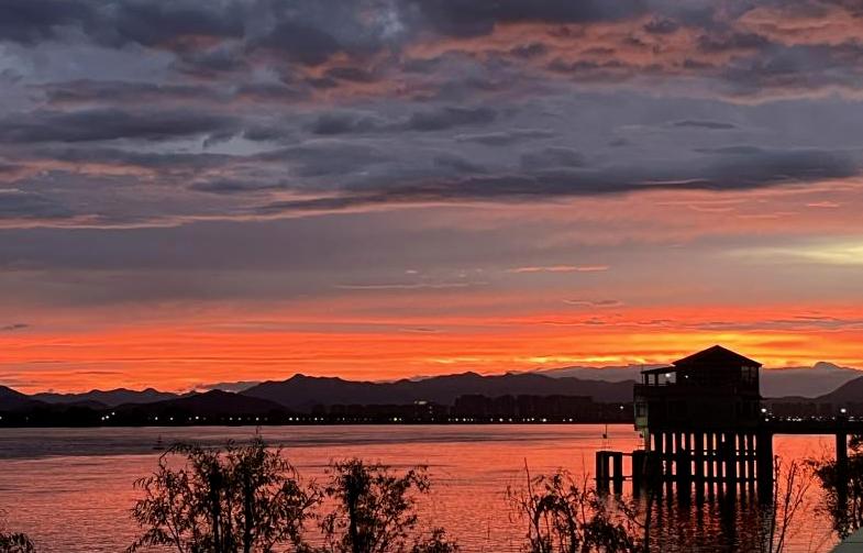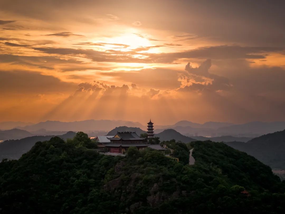 日出如锦,逐渐覆盖天空。爬上去,先看看寺庙。群山叠在绿色的房间里,一轮红日缓缓升起,水面染成金红色,波光粼粼,闪耀着无数碎金。这是湘湖早晨的浪漫。
