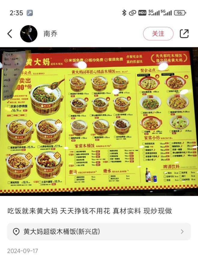 例如黄大妈,成立于2010年,2022年门店不足50家,2023年开始升级门店,将主色调改为显眼的红黄色调,加上双人桌和四人桌,与传统的木桶饭形象不同,并打出“每天吃木桶饭,每次只来黄大妈”的口号。