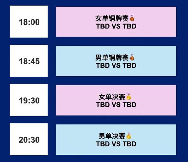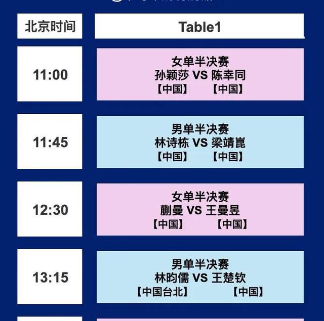 这个比赛日分为两个时间段:11:00 男单和女单半决赛开始了,将在 CCTV5 频道直播。特定场地如下:11:0011:4512:3013:15