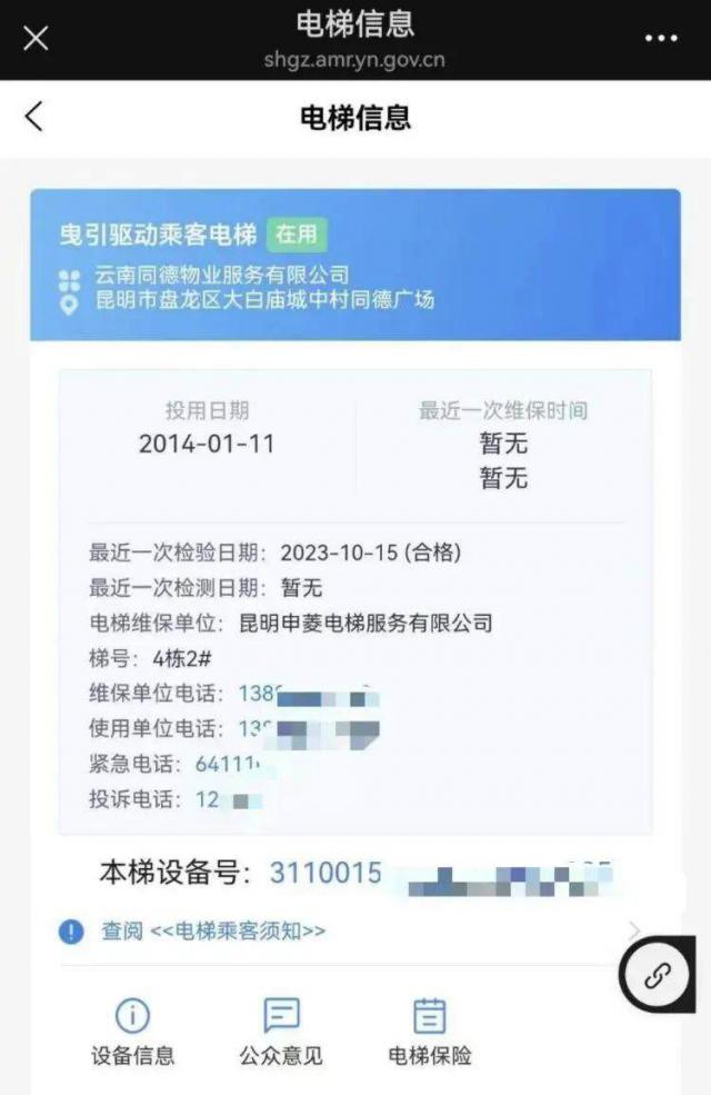 通过扫描 4 栋 2 “云南省市场监管电梯社会共治平台”二维码显示,电梯位于电梯内部: 2014 年 1 月 11 每天投入使用,最后一次维修时间“暂时没有”,最后一次检查的日期是: 2023 年 10 月 15 日。1 电梯号码显示最近的检测时间是什么? 2023 年 10 月 15 日本,最后一次维修是什么时候? 2024 年 9 月 20 日。