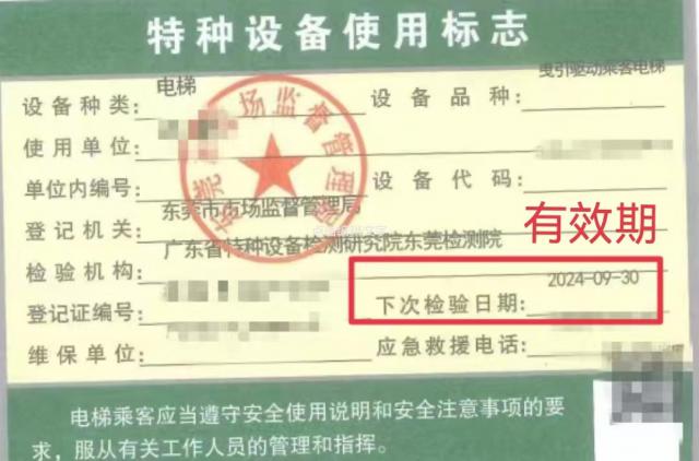 特种设备的使用标志必须贴在电梯的显著位置。如果使用日期在“下一次检测日期”范围内,电梯属于检测合格的电梯。