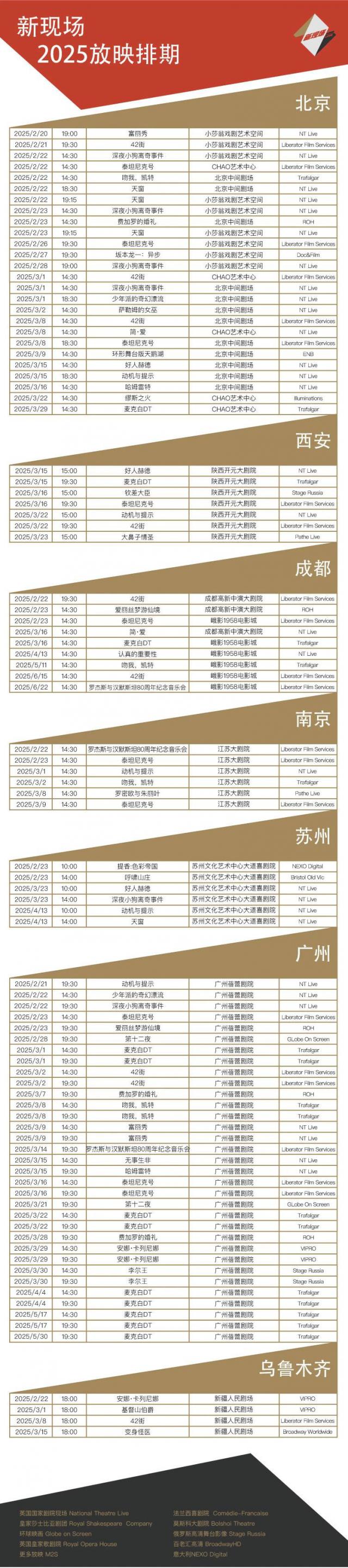 "新现场"超清播放系列由北京奥哲维文化传播有限公司打造,致力于向观众呈现当今世界舞台上最好的作品。通过和包括英国国家剧院、特拉法加发行公司、全球绘画、电影院、松竹有限公司、百老汇高清、法国百代、西班牙数字图像包括多个品牌合作,目前“新现场”超清播放系列的推广来自国家剧院、皇家莎士比亚剧团、皇家歌剧院、莎士比亚环球剧院、莫斯科剧院、法兰西喜剧院、世界顶级戏剧、歌剧、舞蹈、展览影像等多个机构。截至 2024 年 8 月亮,“新现场”播放曲目已经到了。 300 涵盖北京、上海、广州、台北、香港等部门。 69 地面,播放超过 11400 场地,观影人数超过 85 万人。