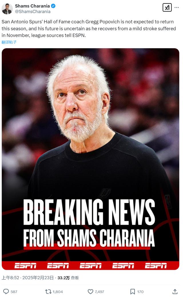 北京时间 2 月 23 日早上 8 点 52 分,据 NBA 名记 Shams 报道,本赛季马刺主教练波波维奇不会回归,将来能否任教也不得而知。在文班发现血栓,赛季报销之后,马刺又遭受了一次打击。波波维奇不仅是马刺主教练,也是马刺运营总裁。