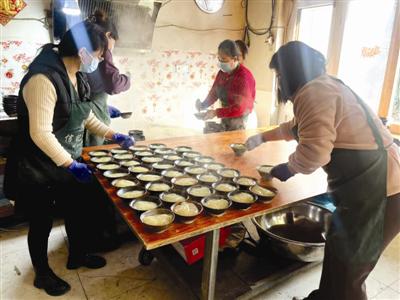 随后,记者在信末庭找到了制作焖子的区域,前院是储存绿豆的仓库,院子是信家焖子的工作区。50 在平方米的操作室里,制作工具摆放有序,老式的木桌堆叠在一起。 600 多个小瓷碗,用来“扣”焖子,低矮的炉灶和铁锅用来煮焖子。这时,信末庭正站在炉子旁边,不停地搅拌红烧子,力度或大或小。我看到红烧子从米色变成了浅黄色,变得越来越粘,浑身起泡。”“这个锅还行。“信末庭招呼众人,随后,四名女工出现,将其放入小瓷碗中。