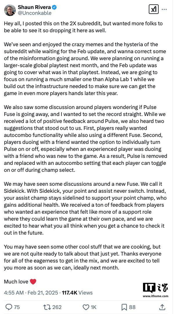 IT 世家 2 月 23 日消息,拳头游戏总监 Shaun Rivera 在 X 该平台发布公告,声称原定于 3 《英雄联盟》格斗衍生作品《2XKO》全球测试计划已延期,开发团队目前正在进一步完善玩家反馈,随后的检测规模将“小得多”。