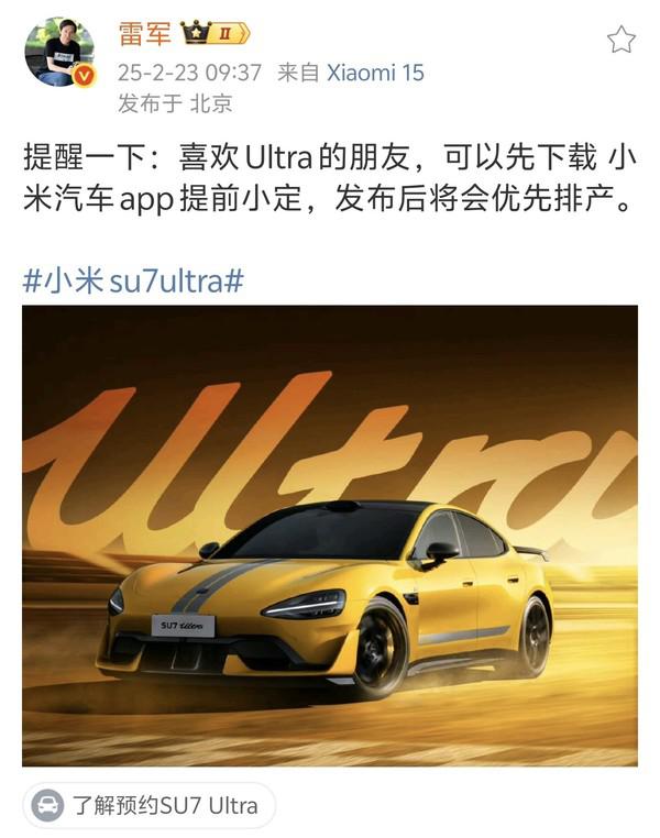 那些喜欢在微博上发言的雷军? Ultra 朋友们,可以先下载小米汽车 app 提前小定,发布后将优先排产。考虑到现在的小米 SU7 产能问题,优先排产很可能会大大减少等待时间。在此之前,雷军曾经说过,计划的小米 SU7 Ultra 年度销售目标是 1 去年发布会后,万辆新车, 10 一分钟就能得到小订单 3680 台子的结果,要知道,新车的预售价格已经到来 81.49 一万元,小订金额要求 1 一万元,这样还是有那么多人毫不犹豫的小订单,可以说它很可能成为同价位车型中的一款爆款。