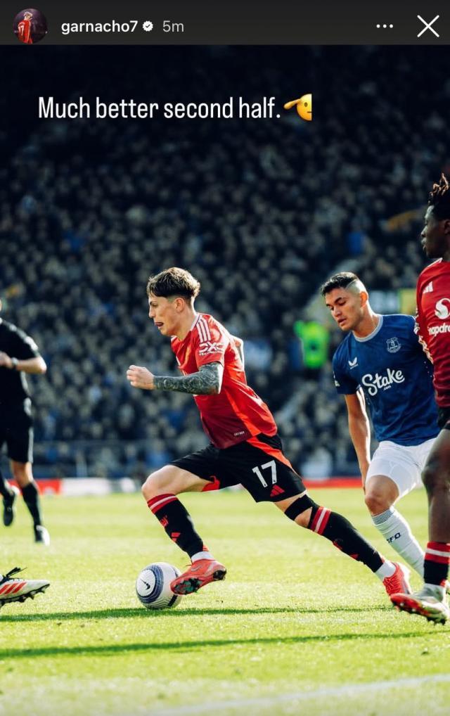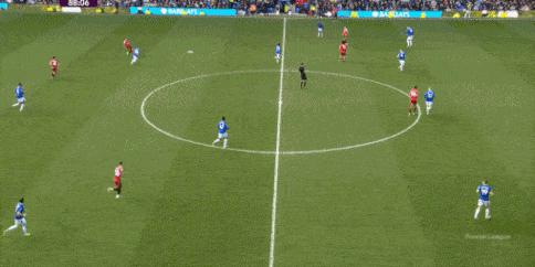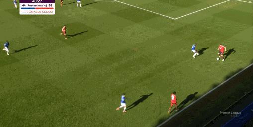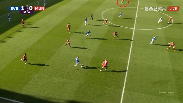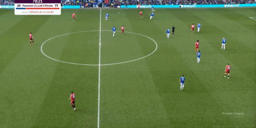 与埃弗顿的后场球员相比,加纳乔的脚底明显更快,所以左侧逐渐形成强侧,不会轻易掉球: