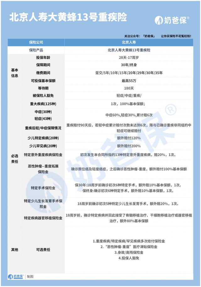 北京人寿大黄蜂在众多儿童重疾保险产品中, 13 大病保险备受关注。