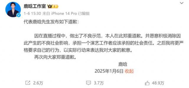 工作室还代表鹿晗道歉。