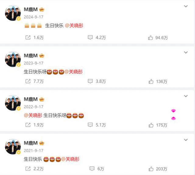 每年的生日,鹿晗和关晓彤都会在微博上送上祝福。