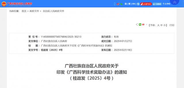 近日,自治区人民政府发布修订后的《广西科技奖励方法》(以下简称《办法》),奖励个人和组织在自治区科技进步活动中做出突出贡献。《办法》自 2025 年 3 月 1 日起施行。