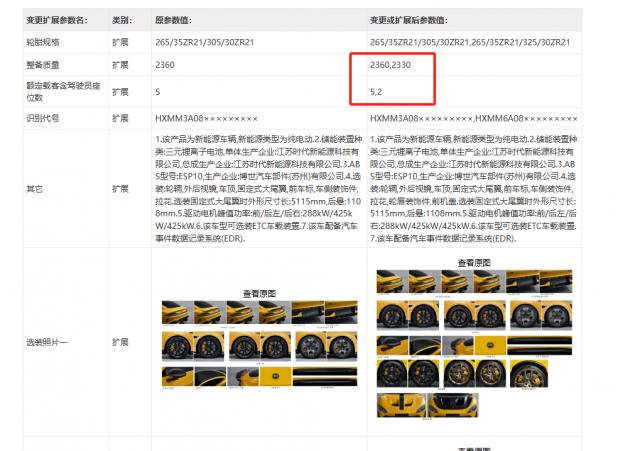 其他方面,基本与之前的申请信息一致,提供固定式大尾翼、碳纤维后视镜、碳纤维车顶、碳纤维车标、碳纤维侧裙等选择。
