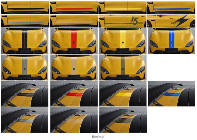与此同时,我们可以看到这种选择,增强了各种颜色和图案的车身拉花,而拉花的位置包括发动机盖、车门和后备箱盖。