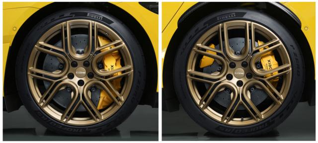 在设计部分,新车配备了大尺寸的前围、黑色侧裙、黄色卡钳组合的全新车轮,以及大尺寸的双色后围、主动开关的尾部扩散器、主动尾翼等。,这与普通车型明显不同。