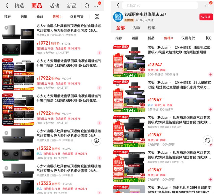 依据京东上的价格,在高端烟灶套餐中,方太烟灶套餐均价在1.3万元左右,其中最贵的套餐价格已经达到1.97万元,而老板电器烟灶套餐中最贵的产品价格在1.39万元左右,而其他大部分产品价格在1.1万元左右。