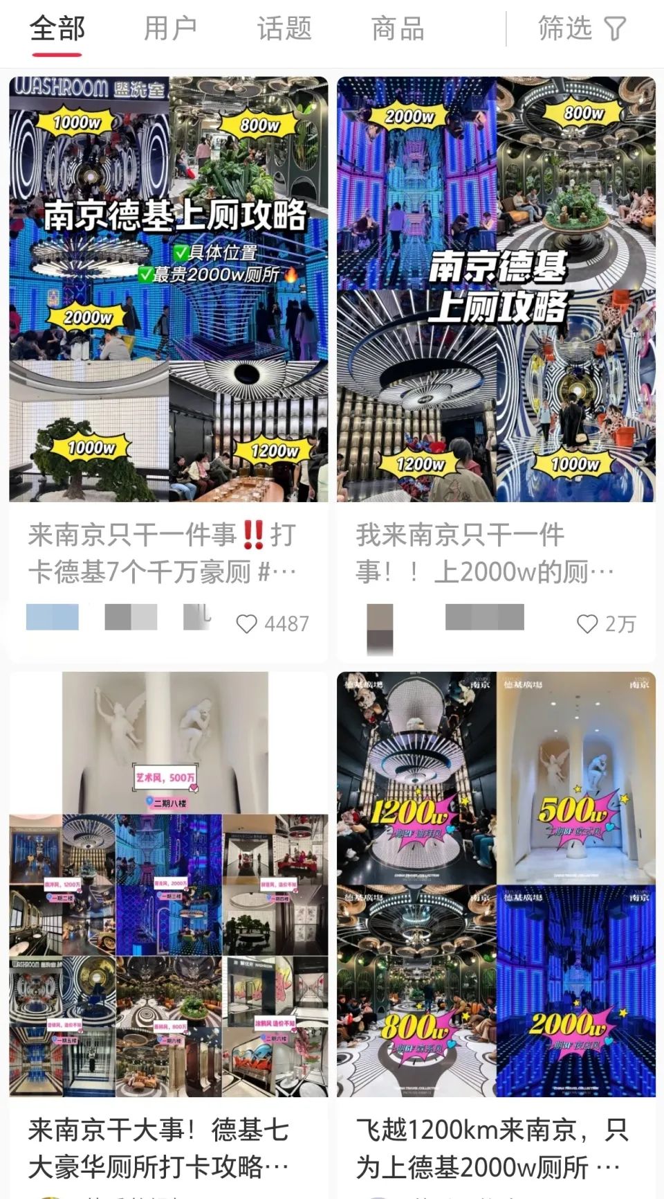 此前,在社交平台上,南京德基最受欢迎的网络名人打卡地是花费数千万建造的七个卫生间。这七个卫生间设计风格鲜明,分别在南京德基的第一期和第二期,被称为“卫生间的爱马仕”,成为南京众多游客的必打卡点之一。