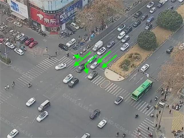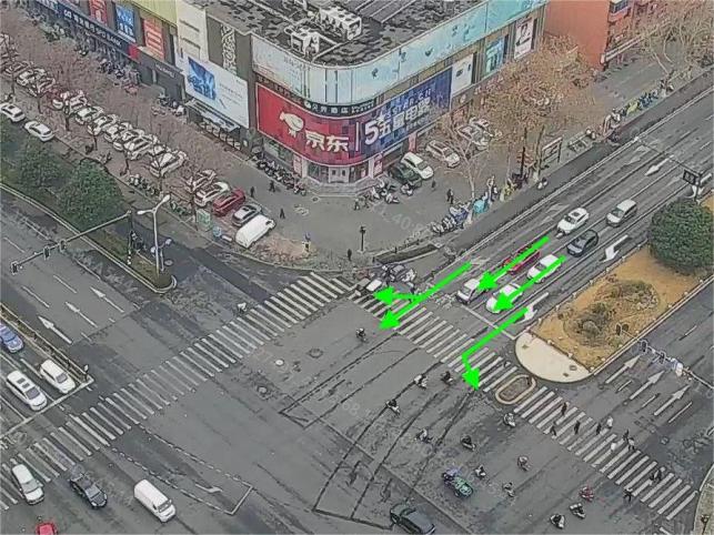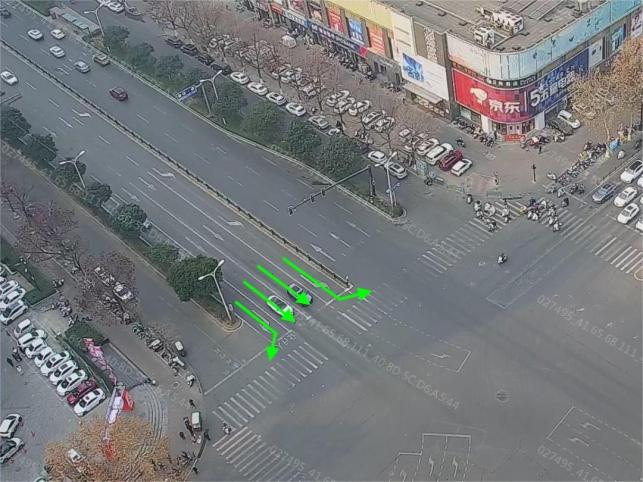 2、从四条车道增加到五条车道,从北向南排列,分别是左转、左转、直行、直行、右转。提醒:公交车可以在保证安全的前提下,通过右转车道直行。