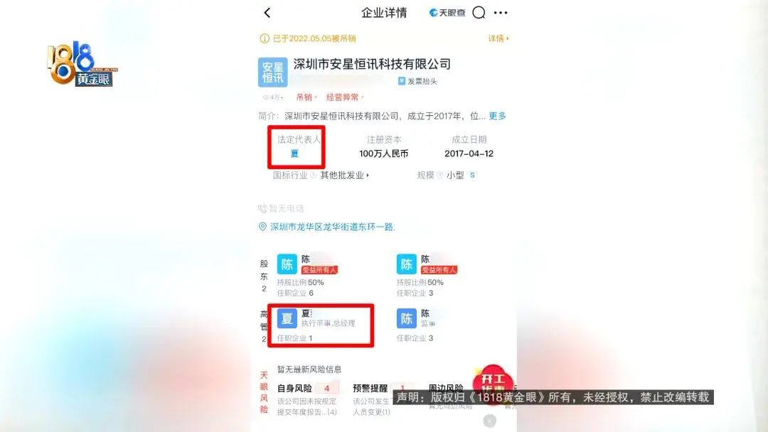 经调查,该公司名为深圳安星恒讯科技有限公司,注册地址在深圳市龙华区。夏女士是该公司的法定代表人、执行董事和总经理。