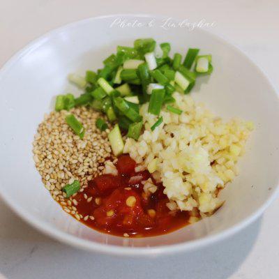 2、剁椒酱、葱姜末、糖、芝麻、葱花。我用的剁椒有盐的味道。如果你现在剁碎,你可以用盐、酱油和油来调味。你也可以加一些陈醋。