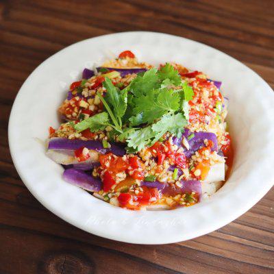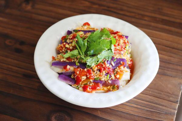 3、蒸好的茄子放凉手掰成条状,倒入调好的酱料拌一拌即可食用。