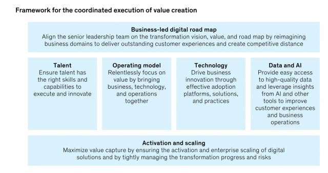 要真正实现 AI 公司需要对其价值进行系统转型。麦肯锡的“ Rewired 框架提出了战略路线图、人才、商业模式、技术、数据和规模六个核心要素。这些要素共同推动企业实现自主文化、现代云实践和跨学科敏捷团队。