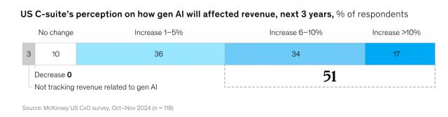 调查显示,企业级高管普遍认为 AI 投资收益有限。只有 19% 受访者表示,收入增长超过收入增长 5%,39% 看到 1% 到 5% 适度增长,36% 表示没有改变。仅 23% 觉得 AI 带来了成本上的积极变化。然而,87% 预计未来三年内高管 AI 这将促进收入的增长,大约一半的人认为增长可能超过 5%。