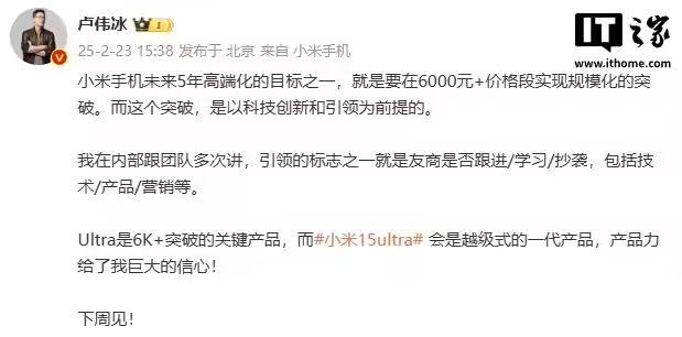 值得注意的是,卢伟冰今天(2 月 23 日)还发文预热小米 15 Ultra 并且称之为“下周见”。