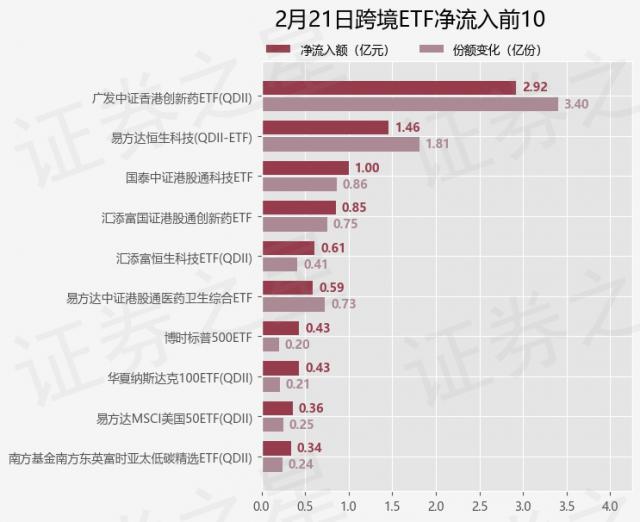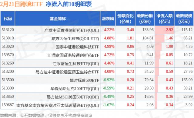 当天有 42 只跨境 ETF 资金净流入显示,其中广发中证香港创新药净流入排名第一。 ETF ( QDII ) (513120),份额增加 3.4 十亿份,净流入额为 2.92 亿元。