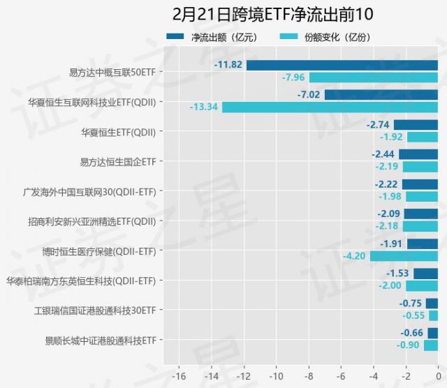 当天有 40 只跨境 ETF 资金净流出,其中易方达中概互联网在净流出中排名第一。 50ETF(513050)减少了份额 7.96 一亿份,净流出额为 11.82 亿元。
