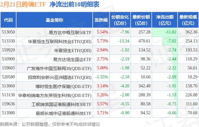 证券之星消息,2 月 21 日跨境 ETF 总资金净流出基金 26.37 亿元,近 5 一个交易日累计净流出 74.53 亿元,5 在一个交易日内,出现了日合计资金净流出。 5 天(ETF 计算资金流入的方法:(当日 ETF 现场流通份额 - 前一交易日 ETF 现场流通份额)* 当天 ETF 均价,数字仅供参考)。