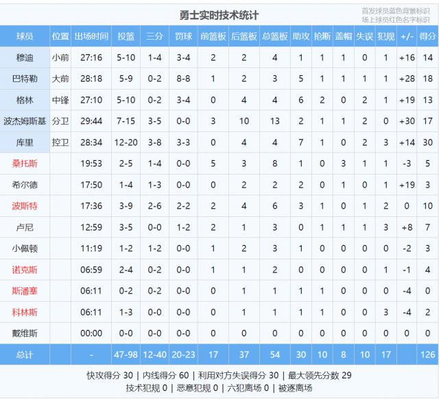 整个比赛结束,勇士 126 比 102 完胜独行侠 24 得分!今日是巴特勒在勇士主场的首秀,表现完美:投球 9 中 5,罚球 8 中 8,拿到 18 分 3 篮板 5 助攻 1 断球 1 帽子,正负值 28 整个比赛的第二高。库里三节打卡,20 投 12 中砍下 30 分 4 篮板 7 助攻 1 断球。