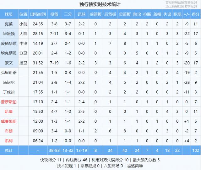 克莱 8 投 3 中,拿到 11 分 2 篮板 2 助攻 2 断球。克里斯蒂 5 中 1,仅拿到 2 分 4 篮板 2 助攻 1 断球。欧文效率也不高,19 中 7 获得 17 分 6 板 4 助 2 帽,正负值 -20。四个独行侠中锋都受伤了,真的没有人!篮板球 42 比 54,内线评分 46 比 60。