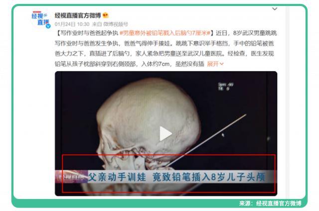 武汉8一岁的男孩被父亲意外地用铅笔戳进后脑勺。7厘米!