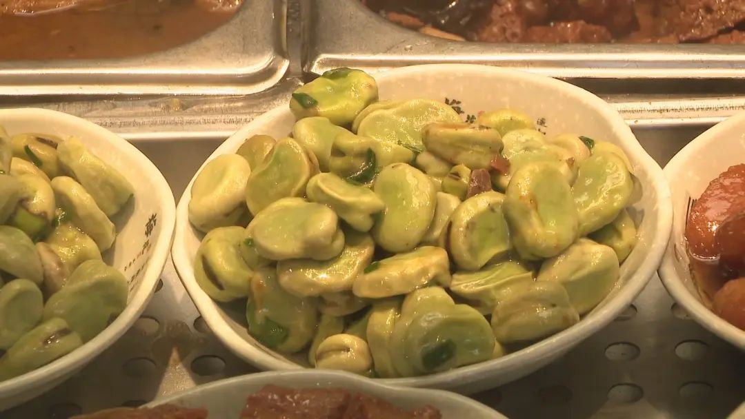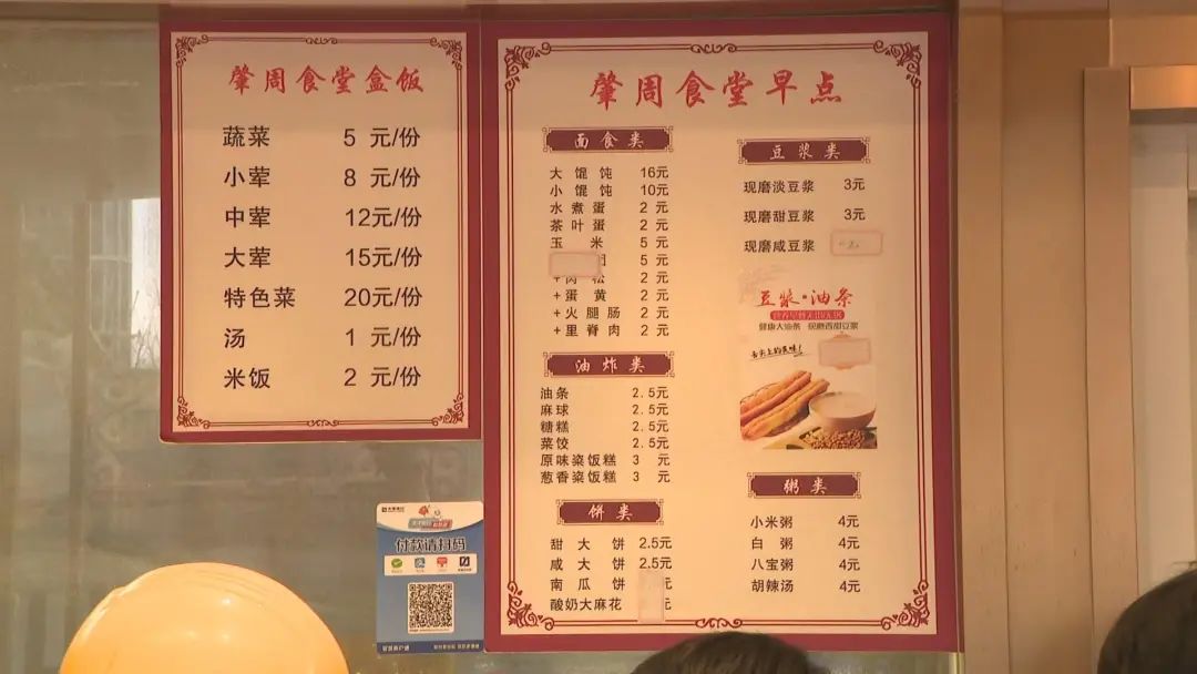 中午11点刚过,记者在肇周食堂看到,来吃饭的顾客已经挤满了整个食堂。贴在显眼位置的价格表清楚地显示:每份蔬菜5元,每份小肉8元,每份中肉12元,每份大肉15元,每份特色菜20元,每份汤1元,每份米饭2元。在菜品的长台上,摆放的菜品非常丰富,比如红烧肉、黄酱、蒸鱼、熏鱼、黄瓜等。,而且还有很多时令菜肴,比如红烧竹笋、韭菜炒鸡蛋、葱油蚕豆等。