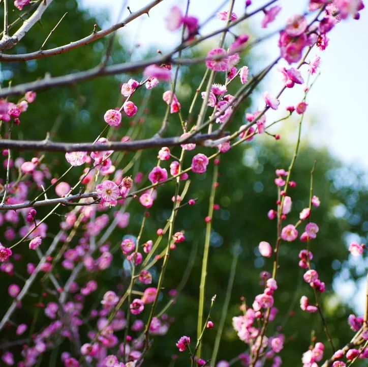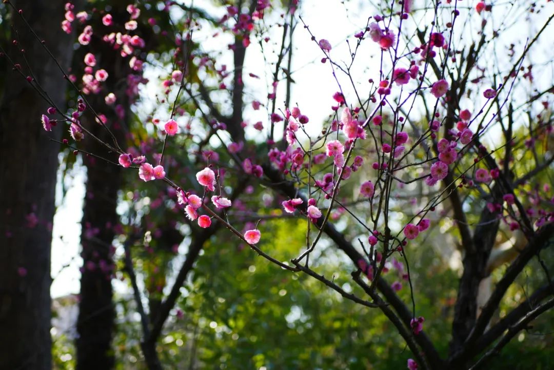 今天,东林梅坞种植了200种不同种类的梅花。在草地的中央,两个有着百年历史的红梅古桩格外醒目,枝头的梅花交织在一起,展现了早春的奇妙之美。走在梅坞,粉色、红色和白色的梅花成簇,在树枝上肆意绽放。