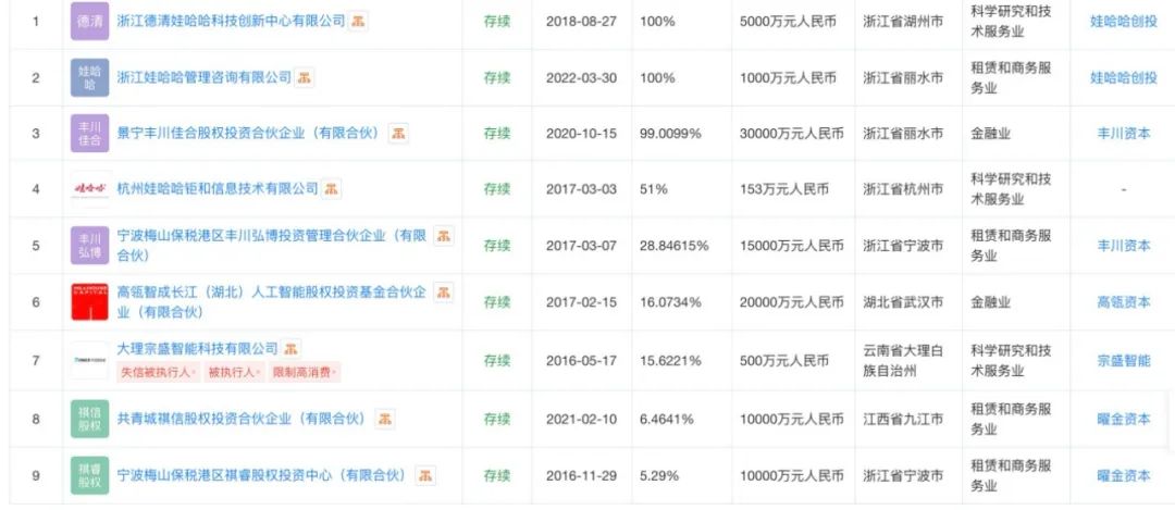 不仅如此,宗馥莉本人也长期涉足风险投资圈。宁波金辉投资管理有限公司成立于2015年,是她100%持仓的个人投资平台。