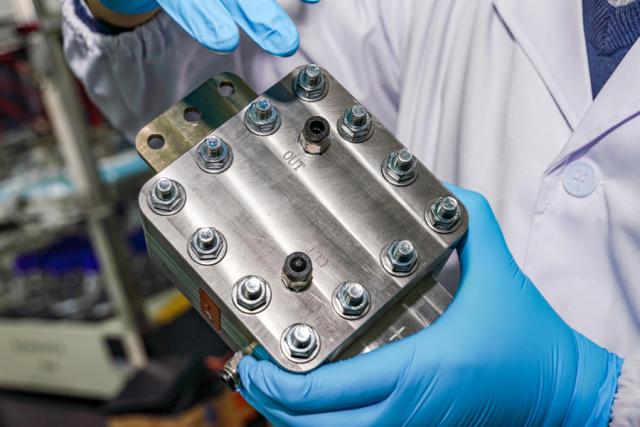 图为 PEM 制氢电解槽。 / 报告记者邢千里摄