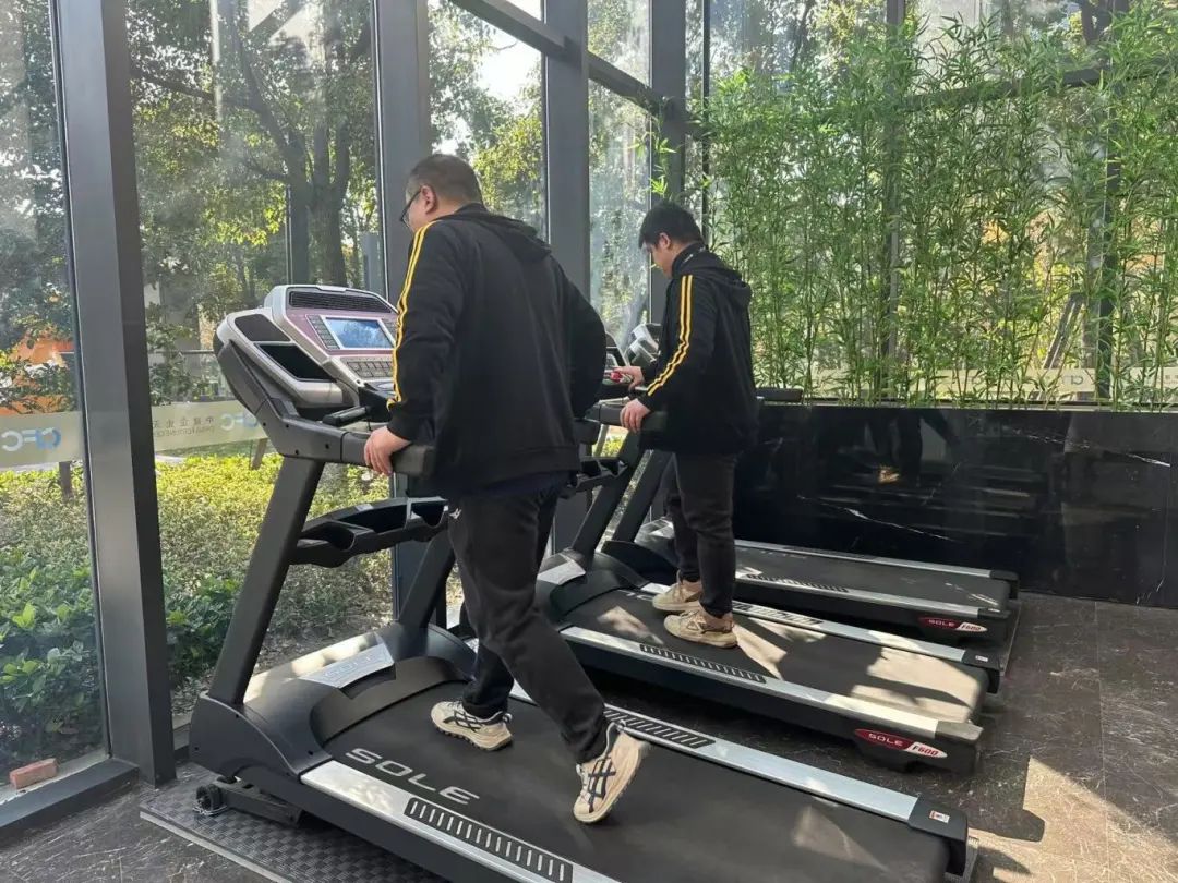 下午,阳光透过中国建筑公司天地1号楼一楼的玻璃幕墙洒在全新的跑步机和整齐的书架上。两名员工在跑步机上挥汗如雨。在另一边的阅读区,几个年轻人手里拿着书,静静地沉浸在文字中。这不是商业健身房或咖啡馆,而是青浦区中国建筑企业天地新推出的共享党群服务站——集党建活动、便民服务、休闲健身于一体的“红色港湾”。