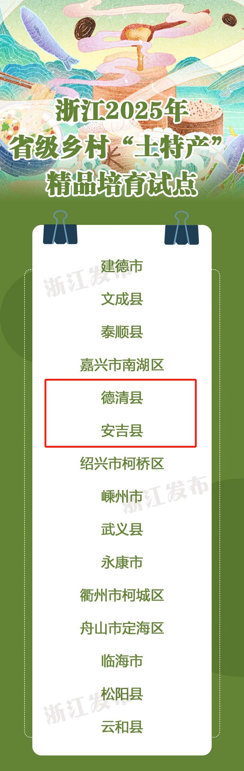 近日,省农业农村厅、省财政厅联合组织开展2025年省级农村“土特产”精品培训试点工作。通过市县申请和专家评审,确定15个县(市、区)进行培训试点,计划安排1.5亿元省级补贴。其中,湖州市德清县、安吉县当选!