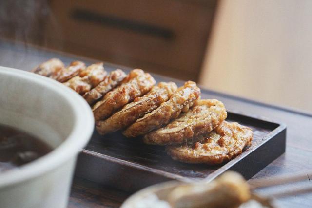炸藕夹是用调味好的猪肉糜酿造而成,然后裹上面糊,夹在油锅里炸至两面金黄。