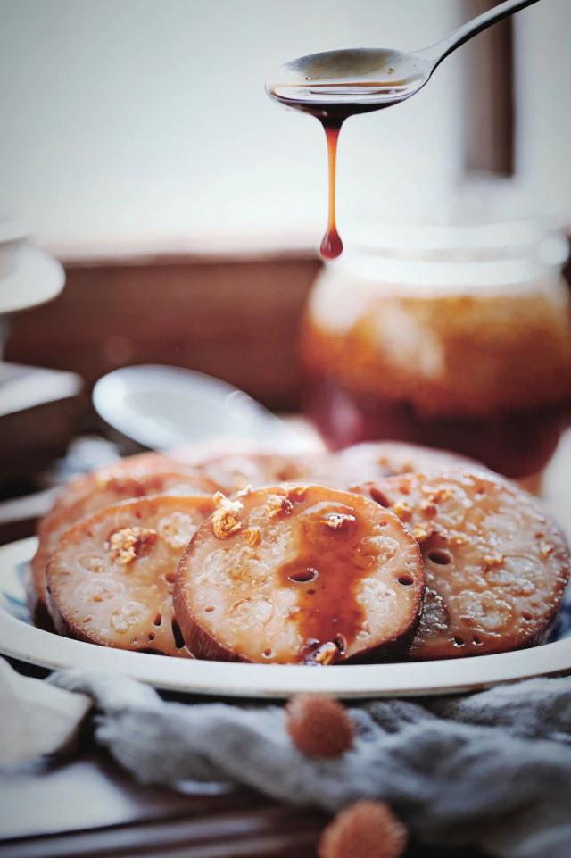 冷却后,切成藕片。晶莹剔透的大米粘在莲藕上,在桂花蜜的灌溉下,美丽的光泽流淌出来,咬一口又软又糯又甜。生活是如此幸福。 ~