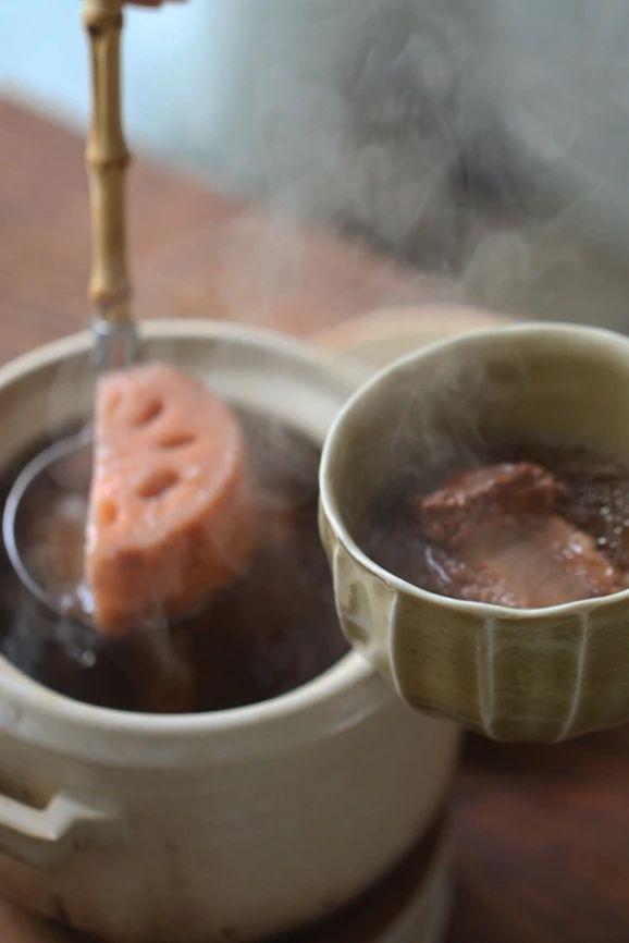 汤会变成淡淡的绯红色,莲藕粉会和若有若无的细条粘在一起,但会在口中融化,和汤一起喝,全身会变得柔软舒适。