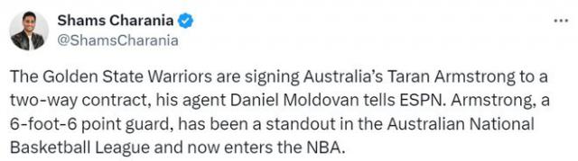 北京时间 2 月 24 日,据名记 Shams 据报道,勇士将与身高相匹配 1 米 98 的控卫塔兰 - 在澳大利亚,阿姆斯特朗签订了双向合同。 NBL 在联赛中表现出色,现在得到了。 NBA 有机会打球。