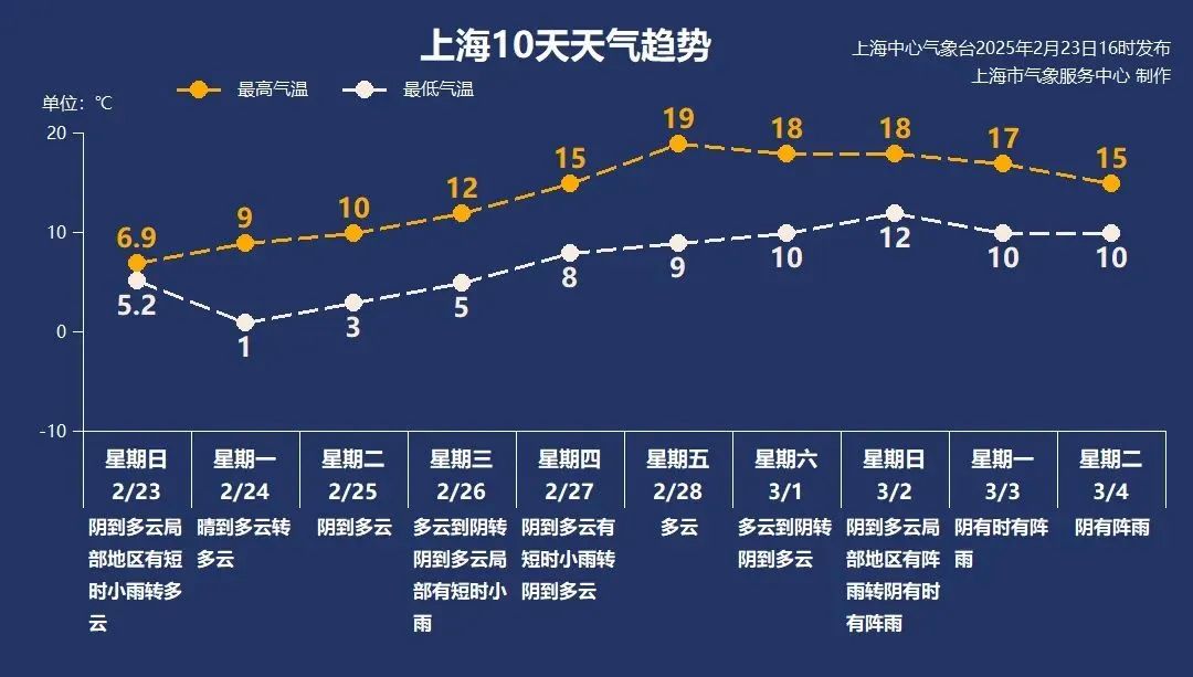 本周,申城气温稳步上升。从周中开始,最高气温恢复到10℃以上,周五最高气温可达19℃。周末最低气温也会回升到10℃,天气明显变暖。