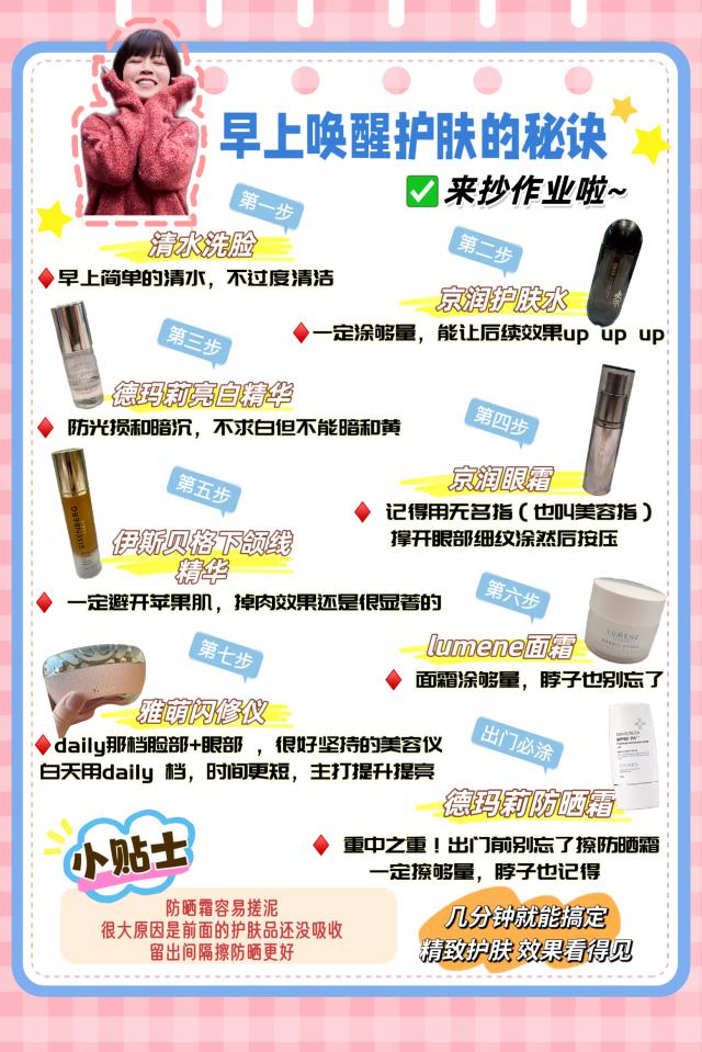 早晨:清洁 - 保湿 - 眼霜 - 美白精华 - 瘦脸精华 - 面霜 - 闪修 - 防晒