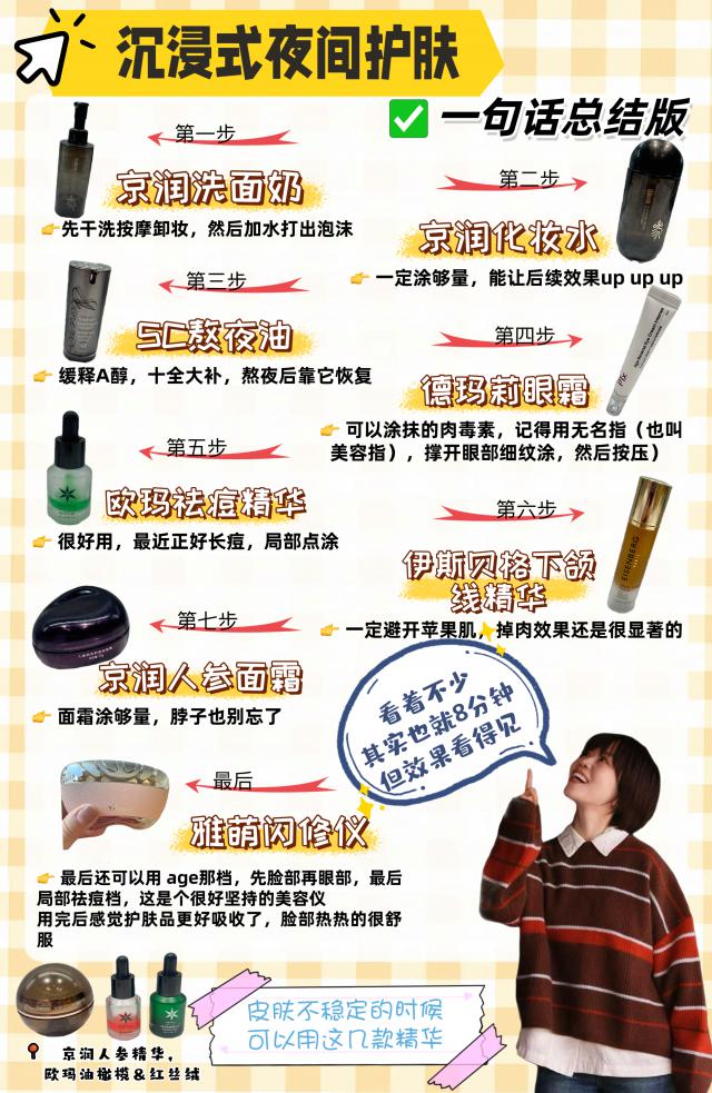 一直有女朋友问我怎么保养,尤其是脸上涂什么。先用什么?后面用哪个?其实直接介绍产品和我的风格不太像,但是评论太多了。我只是直接记录了我早晚护肤的完整过程。评论区的助理也为大家整理了护肤品的笔记,结果被吞了又吞,就直接发到这里了。
