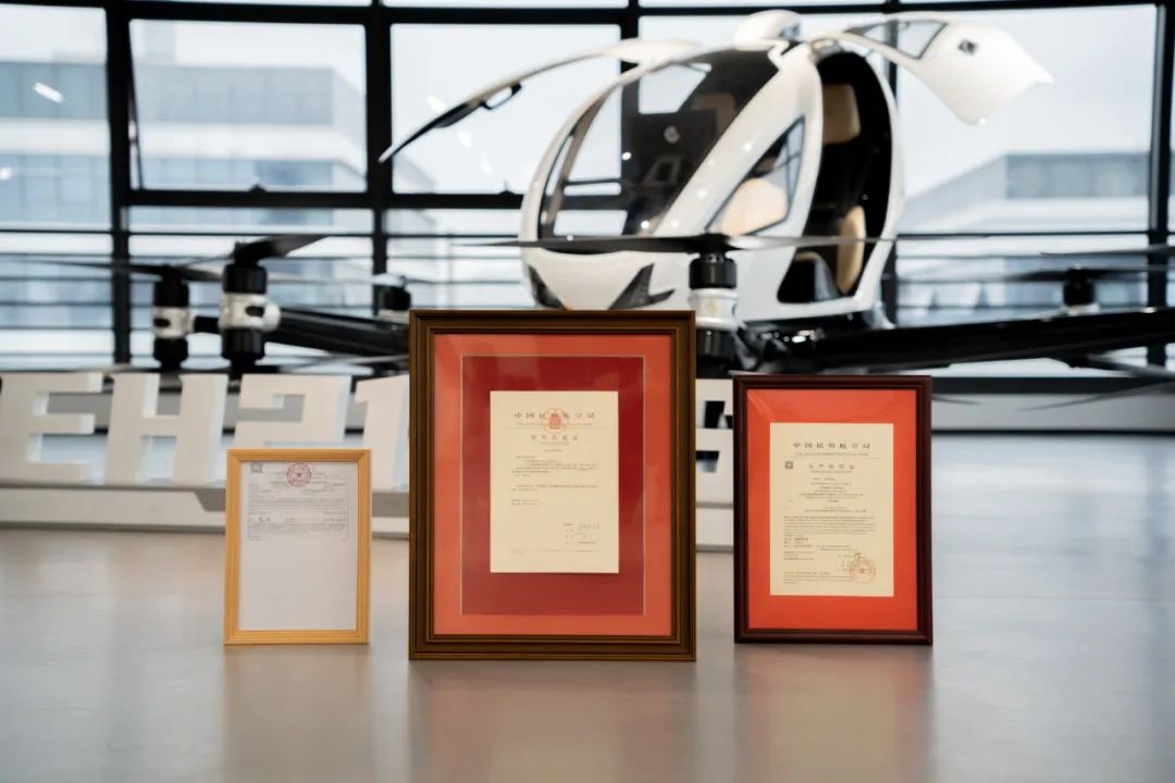 2024年4月7日,亿航智能核心产品EH216-S在中国拿下全球eVTOL行业第一张生产许可证,成为全球第一个跨过世界民用航空发展“三证齐全”里程碑的eVTOL产品。EH216-S最大设计速度为130km/h,最大航程30km,最大航时25分钟。在拿到最后一张证件后,亿航智能也收到了来自全国的多个订单,并在2024年12月20日向广东丹霞山景区交付了5架航空器。