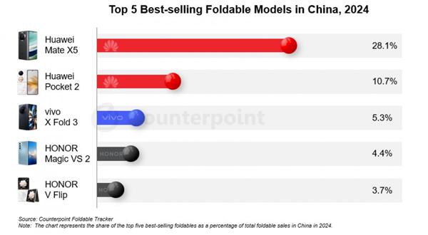 目前,在中国市场上,超过一半的折叠手机销售是华为,其中一半是华为, Mate X5 和 Mate X6 它是书本折叠手机中最畅销的商品, Pocket 2 和 Nova Flip 这是最受欢迎的翻盖手机。