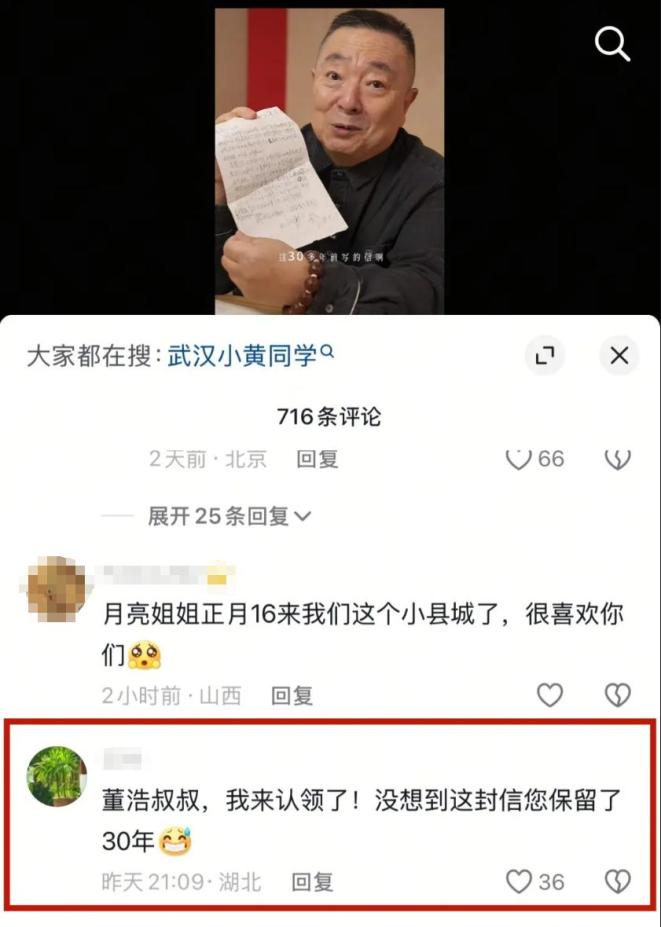 最新消息,小黄找到了!2月18日,小黄在短视频平台上留言:“董浩叔叔,我来收了。没想到你把这封信保存了30年。”